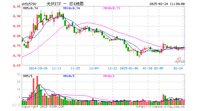 2月24日,截止午间收盘,光伏ETF(515790)涨0.13%,报0.742元,成交额3.41亿元。光伏ETF(515790)重仓股方面,阳光电源截止午盘跌0.04%,TCL科技跌0.41%,隆基绿能涨0.68%,特变电工跌0.49%,通威股份涨0.68%,TCL中环涨0.00%,晶科能源涨0.16%,晶澳科技涨2.33%,正泰电器跌0.78%,罗博特科涨2.75%。