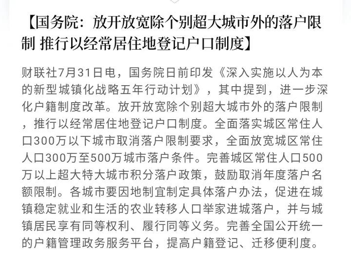 当前,我国90%以上的城市都已取消落户限制,只有以北上广深为代表的个别超大特大城市成为例外。