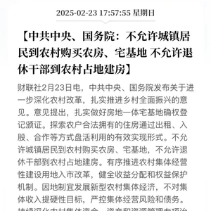 日前印发的中央一号文件强调“两个不允许:不允许城镇居民到农村购买农房、宅基地,不允许退休干部到农村占地建房。