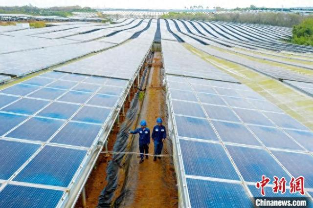 在乐东黎族自治县莺歌海盐场,曾经的纳潮湖已经变身为海南最大的集中式光伏基地。涨潮时,一块块熠熠生辉的光伏面板除了吸收直射的阳光,还吸纳水面折射的阳光。这个发电厂每年可新增绿电3.2亿千瓦时。