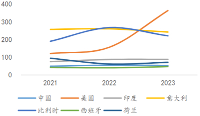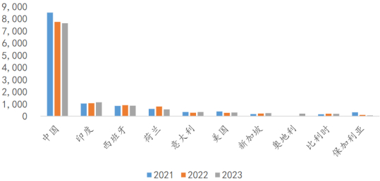 2021-2023年全球抗菌素原料药出口量(十吨)