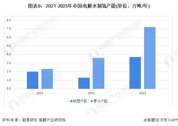 氢能源制取方式多样,包括电解水制氢、化石燃料重整制氢、生物制氢等,其中电解水制氢若利用可再生能源发电来进行,可实现绿色低碳生产。综合公开披露与线下调研所得的信息统计,2023年1月至12月,中国电解水制氢新增产能约3.7万吨/年,同比增长约181%;截至2023年12月底,中国电解水制氢累计产能约达7.2万吨/年,相较上年度同期实现100%的增长。