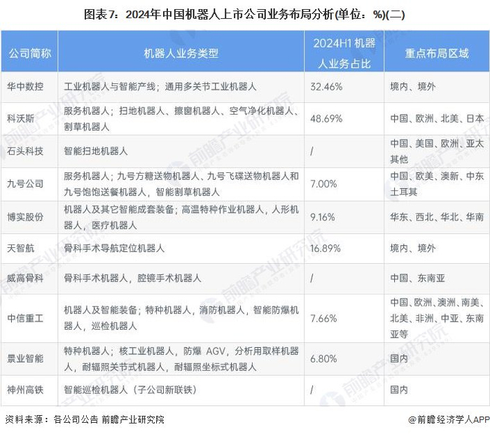 机器人上市公司机器人业务布局涵盖工业机器人、服务机器人及特种机器人等领域;从区域布局来看,机器人企业均布局国际化业务,如埃斯顿、机器人等,在全球多地设有业务;从业务专注度来看,工业机器人企业业务专注度较高,机器人业务占比较高,服务机器人领域科沃斯、石头科技专注度较高,威高骨科、天智航、中信重工、景业智能等在医疗手术机器人、高温作业机器人等特种机器人领域有所布局。