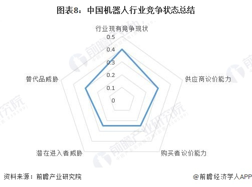 根据以上分析,对各方面的竞争情况进行量化,0.5代表最大,0代表最小,目前我国机器人行业五力竞争总结如下: