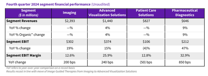 除了技术,在这场AI影像变革中,似乎已有企业已在营收上“上岸”。2月13日,GE医疗公布了2024年全年财务报告,2024年全年营收197亿美元,同比增长1%。GE医疗的AVS业务(含AI影像、手术导航等)全年营收51亿美元,EBIT利润率高达25.9%,成为最赚钱的业务。GE医疗正在从硬件设备商向“精准医疗生态”的转型。