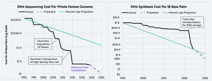 《Big Ideas 2025》报告指出多组学技术将在2030年左右迎来量级提升,DNA 读取成本下降100倍,DNA合成成本下降1000倍,加速基因组学发展。