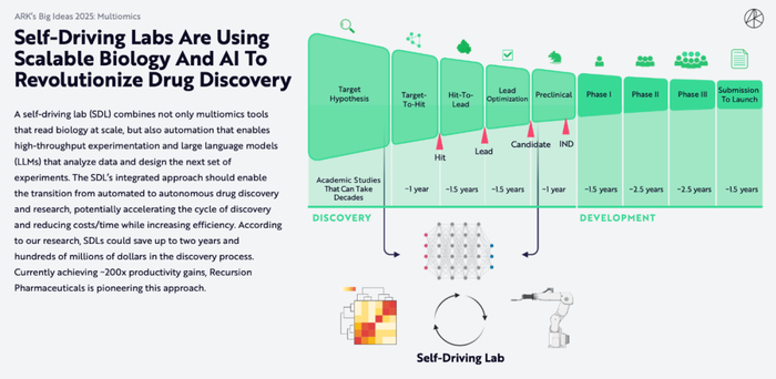 Cathie Wood表示,AI与多组学技术的结合将彻底改变生物医药行业,推动药物研发、医疗诊断和治疗的指数级增长。