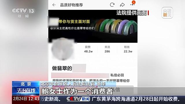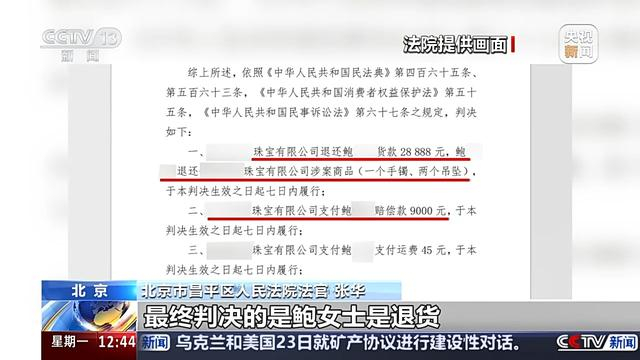 北京市昌平区人民法院法官 张华:玉镯和吊坠本身的价值没有办法区分,法院经过询价,综合考虑市场行情,酌定了玉坠的价值是3000元。由商家对玉坠这部分商品进行了惩罚性赔偿,最终判决鲍女士退货,商家进行了全部货款退还,并承担吊坠三倍,惩罚性赔偿9000元。