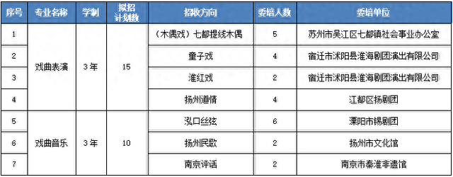 本次招生为苏州市吴江区七都镇、沭阳县淮海剧团演出有限公司、江都区扬剧团、溧阳市锡剧团、扬州市文化馆、南京市秦淮非遗馆等单位定向委培,考生及家长需与其签订学习、就业协议。学生毕业经考试合格后,进入相应单位工作。