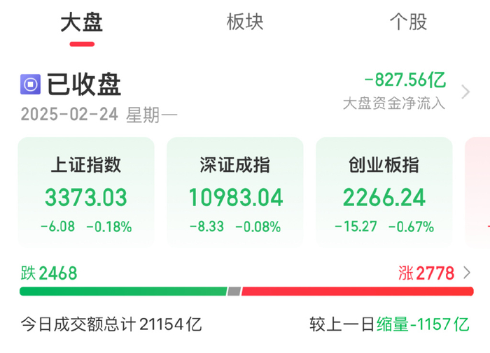中国商报(记者 王彤旭)2月24日,A股三大指数集体调整。截至收盘,沪指跌0.18%,深成指跌0.08%,创业板指跌0.67%,北证50指数涨0.13%。全市场成交额连续第二个交易日突破2万亿元,较上一日缩量1157亿元。全市场超2700只个股上涨。