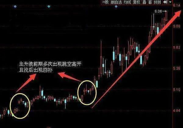 比如中国石化,10月10日、11月22日走势,该股主升浪启动时多次出现向上跳空缺口,并且都没有回补,之后股价展开了最具爆发性的三浪上升。