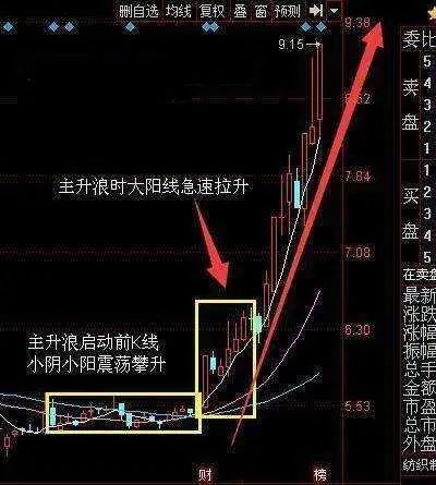 比如上图是咱们刚刚操作的中银绒业主升浪启动前走势,启动前k线小阴小阳排列,走势上处于一个震荡攀升阶段,而进入主升浪之后,股价进入急速拉升阶段,不断拉出大阳线。