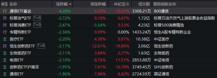 另一边则是通信ETF领跌,医疗、游戏、云计算等主题产品跟跌↓