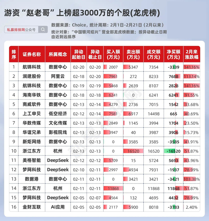2月以来,游资“赵老哥”的常用席位“中国银河证券绍兴营业部”比较活跃!有鉴于此,笔者梳理出了该席位在2月以来龙虎榜上榜金额超3000万元的个股,供大家参考。(同一只个股上榜日期无重叠,存在不同日期反复上榜的情形)