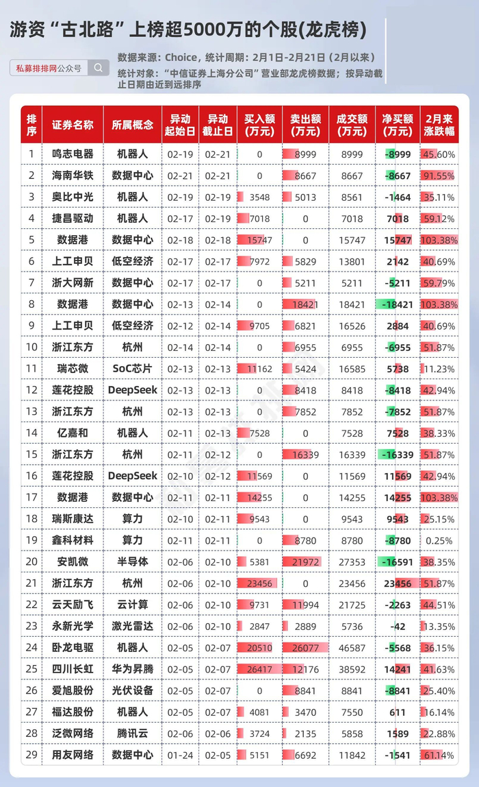 从龙虎榜数据来看,2月以来,游资“古北路”主要参与的方向包括AI算力(数据中心、云计算)、机器人;最新动向来看,2月21日龙虎榜显示,“古北路”卖出2只个股合计超1.7亿元!