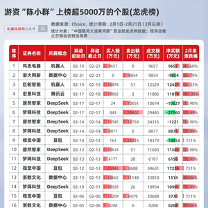 不难发现,2月以来,陈小群参与的个股主要是AI概念股,包括DeepSeek、豆包概念。数据中心等。其中,多次上榜梦网科技、视觉中国、居然智家等,分别在2月17日、2月14日成功逃顶。最新动向方面,2月21日龙虎榜显示,陈小群净买入机器人概念股鸣志电器约9657万元。