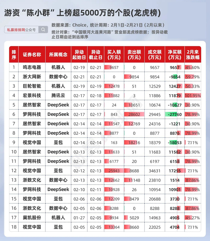 根据Choice数据,陈小群常用的席位“中国银河大连黄河路”证券营业部2月以来比较活跃,笔者梳理出了该席位在2月以来龙虎榜上榜金额超5000万元的个股(同一只个股上榜日期无重叠,存在不同日期反复上榜的情形)。