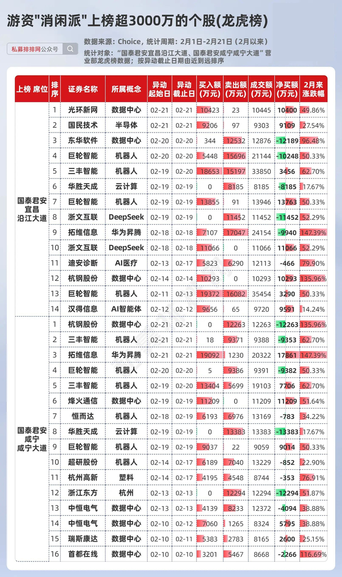 从龙虎榜数据来看,游资“消闲派”的两个常用席位经常一同现身同一只个股的龙虎榜。2月以来,游资“消闲派”主要参与的方向包括机器人、AI算力(数据中心、云计算、华为昇腾)、AI应用。