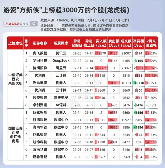 根据Choice数据,2月以来,游资“方新侠”的两个常用席位“中信证券西安朱雀大街”和“国投证券西安曲江池南路”证券营业部相对比较活跃,有鉴于此,笔者梳理出了这两个席位在2月以来龙虎榜上榜金额超3000万元的个股,供大家参考。(同一只个股上榜日期无重叠,存在不同日期反复上榜的情形)