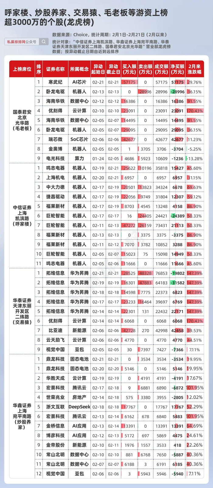 游资“毛老板”的席位“国泰君安北京光华路”证券营业部在2月以来参与的方向主要是算力和机器人。其中,多只个股的上榜金额上亿元,最新数据显示,2月21日,游资“毛老板”净买入AI芯片龙头公司寒武纪近5.72亿元。