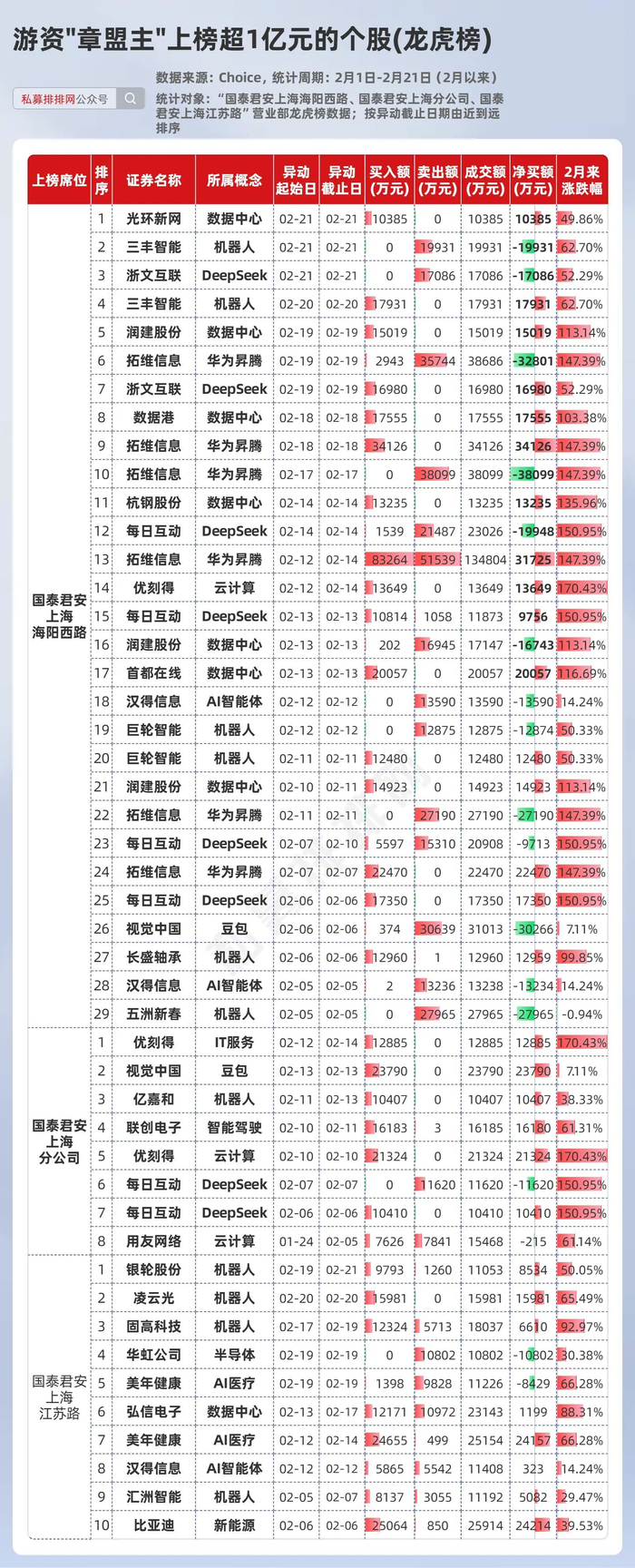 上榜金额最多的是2月19日-2月20日期间,买入机器人概念股三丰智能近18653万元,卖出15197万元!最新动向为在AI算力板块进行调仓换股,2月21日净买入3只个股(包括拓维信息),净卖出2只个股。