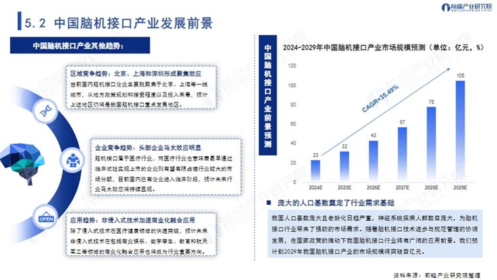 蓝皮书还指出,脑机接口技术的应用潜力巨大,未来应重点关注医疗健康和商业娱乐两大应用场景。我国人口基数庞大且老龄化日趋严重,神经系统疾病人群数目庞大,为脑机接口行业带来了强劲的市场需求。随着脑机接口技术进步与规范管理的协调发展,在国家政策的推动下我国脑机接口行业将有广阔的应用前景。前瞻产业研究院预计到2029年我国脑机接口产业的市场规模将突破百亿元。