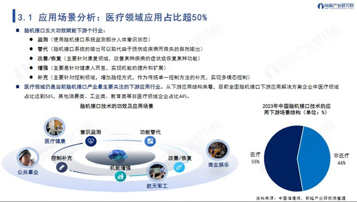 前瞻产业研究院重磅发布《2025年脑机接口产业蓝皮书——未来将至,打造人机交互新范式》(以下简称“蓝皮书”)指出,医疗领域是当前脑机接口产业最主要关注的下游应用行业。从下游应用结构来看,目前全国脑机接口下游应用解决方案企业中医疗领域占比达到56%。其他消费类、工业类、教育类等非医疗领域企业占比44%。