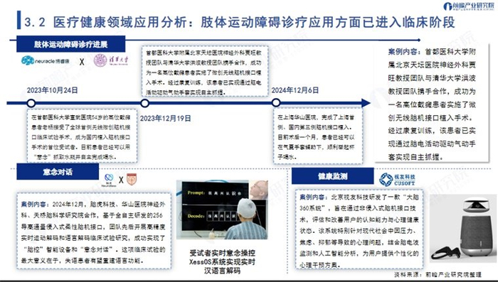 在医疗领域,其中,在肢体运动障碍诊疗方面,该技术已经迈入了临床阶段。2024年12月,上海华山医院成功完成了上海首例、国内第三例脑机接口植入手术。术后一个月,患者已经在气囊手套的辅助下,能够顺利地举起杯子喝水。