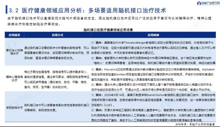 由于脑机接口技术可以直接实现大脑与外部设备的交互,因此脑机接口技术还可以广泛的应用于意识与认知障碍诊疗、精神心理疾病诊疗和感觉缺陷诊疗等领域。