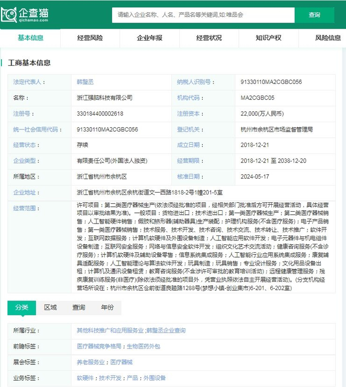 强脑科技(全称:浙江强脑科技有限公司)是杭州“六小龙”之一。企查猫资料显示,该公司成立于2018年,法人代表是韩璧丞,注册资金为22,000(万人民币),专注于脑机接口技术的研发与应用。公司由哈佛大学博士韩璧丞创立,是全球首家脑机接口领域的独角兽企业。强脑科技成功研发了全球首个非侵入式脑机接口的智能义肢,打破了国外技术垄断。目前,强脑科技已实现全球首个便携式高精度脑机接口产品的10万台量产,广泛应用于医疗、教育等领域。