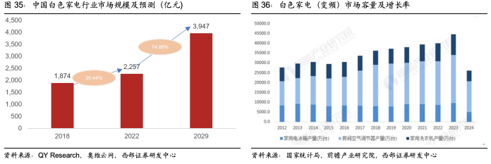 中国白色家电市场容量大,变频空调等高端变色家电对电机驱动控制芯片提出更高要求。报告显示,2022年我国白色家电市场规模达到2256亿元,预计2029年中国白色家电市场规模将达到3947亿元。近年来,包括空调、冰箱和洗衣机在内的白色家电提出了追求更高的性能、追求无级变速、节能降耗等效果,提出了高要求同时提供机遇。以变频空调、变频冰箱和变频洗衣机为代表的高端白色家电销量逐年上升,BLDC电机逐渐被广泛使用。