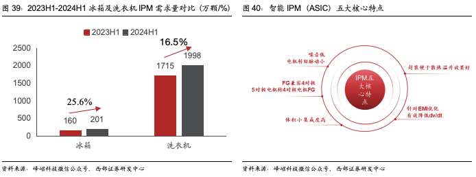 产业在线数据显示,2024年上半年中国三大白电销售同比增长14.4%,白电产品用IPM内销同比增长13.9%,市场规模为2.38亿颗,白电IPM国产替代持续加速。IPM基于先进的超高压工艺技术+国际先进的多层外延超级结技术,广泛应用于变频家电、工业产品和消费电子等领域。