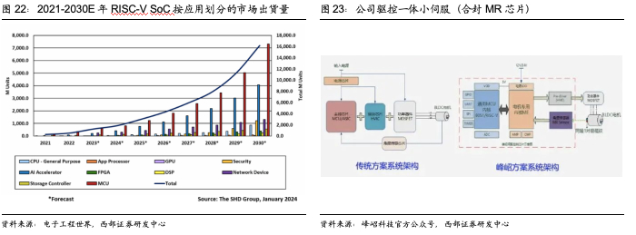 根据SHD group预测,2030年,基于RISC-V架构的全球MCU市场规模可达72亿美元,CAGR为42.0%。在RISC-V大力向高端市场推进的背景,想要扩大竞争优势,在市场量级能够支撑研发投入的前提下,自研RISC-V内核或许是公司最佳选择。