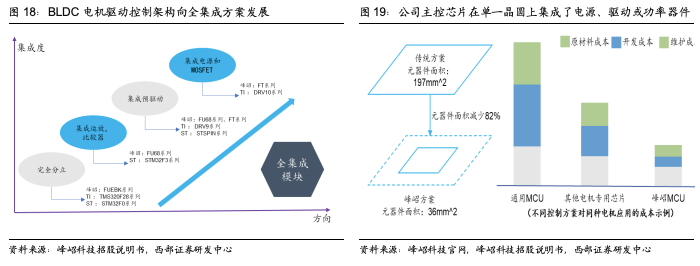 自研“双核”MCU提升集成度,可降低控制器PCB尺寸。公司控制专用芯片已在内部集成电机驱动控制方案所需外设,如高速运算放大器、比较器、LDO、预驱动,部分芯片还集成MOSFET,大大减少外围器件,最大程度上精简了控制板,降低元器件所需面积。可靠性大大提高,有效降低整体方案成本。目前,公司已实现了芯片设计的半集成、全集成方案。