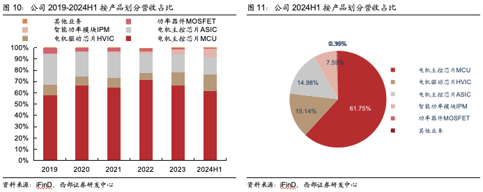 公司各系列产品广泛应用于小家电、白电、电动工具、运动出行、工业、汽车与人形机器人等多个领域。公司稳扎稳打泛小家电、白电市场,积极配合客户国产替代策略,并稳步拓展汽车、服务器与人形机器人等新兴市场。近年来,多款新品层出不穷,如智能IPM新品满足白电市场新需求、RISC-V架构的伺服控制芯片用于汽车、人形机器人等领域,为公司中长期业绩增长赋予源动力。