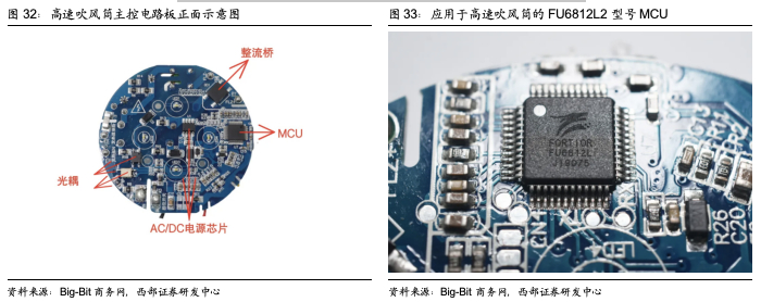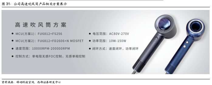 高速吹风筒是电机转速在10万转/分钟以上的吹风机,此类吹风机采用直流无刷电机马达,具有转速高、体积小、寿命长等优点。针对高速吹风筒,公司推出两款MCU方案,具有稳定闭环、快速启动、精准恒温控制、超高转速控制等优势。