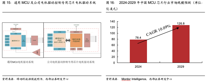 MCU芯片国产替代空间大,国产化诉求强烈。根据Mordor Intelligence 预测,2024年中国 MCU 市场规模为78.4 亿美元,预计到 2029 年将达到 126.8 亿美元,预测期的CAGR为10.09%,市场处于快速成长阶段。国内企业由于成本、服务能力等优势已逐步完成了中低端MCU领域的国产化,带动中国MCU芯片市场规模快速上涨,并不断开展高端化MCU芯片研发。