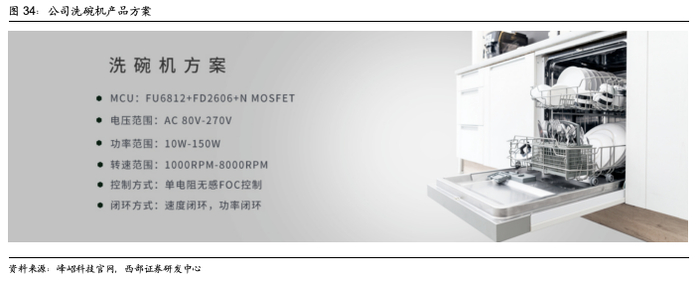 针对厨电,公司推出油烟机、洗碗机、料理机等方案。以洗碗机为例,芯片拥有出色的运算能力和快速的指令执行速度,相当于厨电的“大脑”。它不仅能够在短时间内处理大量的数据和复杂的算法,确保洗碗机在运行过程中能够迅速响应各种控制指令,还能精确控制洗涤水温、调整洗涤时间,智能判断餐具的脏污程度并相应地调整洗涤模式。