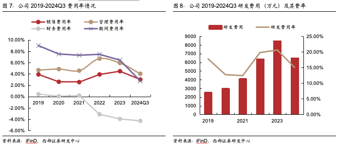 研发费用持续增加,构建技术护城河。公司重视自主研发,坚持走自主创新、高质量发展之路,研发费用增强产品竞争优势。公司研发费用持续上升,保持较高增速,2023年公司研发费用总计8467.43万元,同比增长32.63%,研发费用占当期营业收入比例为20.58%,同比提高0.82个百分点。2024年前三季度公司研发费用总计6507.88万元,同比增长25.13%。