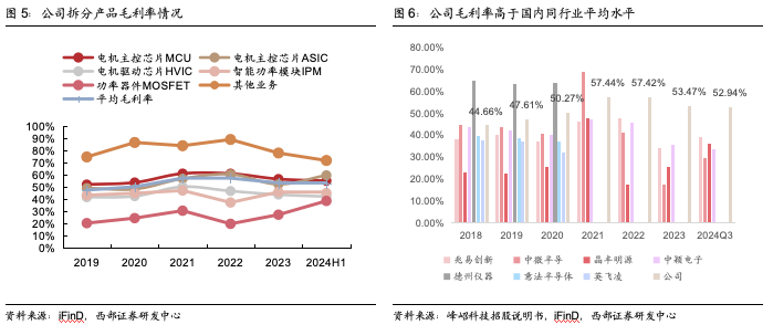 公司具有较强自主定价权,毛利率高于国内同行业平均水平。公司紧扣应用场景复杂且多样的电机控制需求,坚持技术研发的自主及创新路线,在自主芯片内核、算法硬件化、器件集成化等方面走在竞争对手前列。