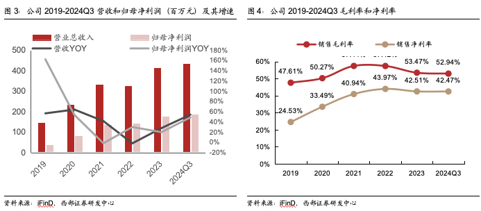 营收增速快,质量高。公司2019-2023年营业收入总体保持较快的增长趋势,由2019年的1.43亿元增长至2023年的4.11亿元,CAGR为30.26%。公司持续战略布局,产品销量增长,营收同比增长可观,2024年前三季度实现营收4.33亿元,同比增长53.72%;实现归母净利润1.84亿元,同比增长48.23%。公司盈利能力持续保持较高水平,2023年毛利率和净利率有所下降,主要受市场竞争影响,公司在扩大市场份额过程中,部分产品价格承压;24Q3公司毛利率52.49%,环比增长0.25pct,稳中有升。