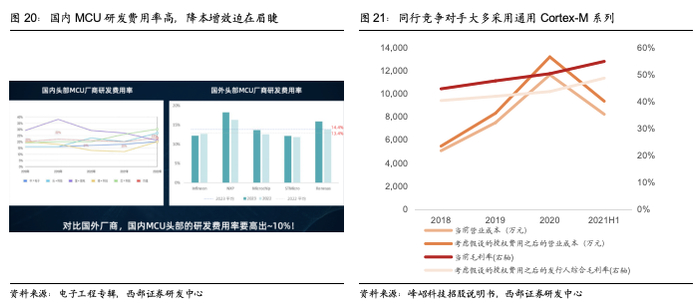同行竞争对手大多致力于开发通用MCU,其内核架构一般采用ARM公司提供的Cortex-M系列内核。IP内核依赖于ARM公司的授权,需支付其IP授权费用。从图21测算结果看,拥有自主IP内核有效提升公司毛利率水平。