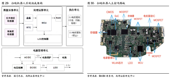 一台扫地机器人主要包含主控芯片、传感器芯片、电源管理芯片、WiFi芯片、存储芯片和视觉芯片等。主控芯片MCU是扫地机器人的“大脑”,负责控制机器人的整体运行和智能决策。通过接收来自传感器的数据,根据预设的算法和程序,对数据进行处理和分析,然后输出相应的控制指令,控制机器人的运动和行为。