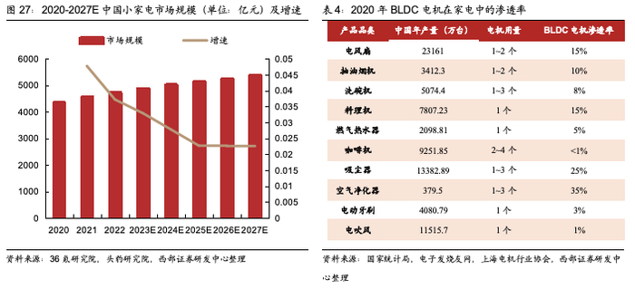 受益于BLDC 电机高效率、低能耗的优势,在扫地机器人等智能家电纷纷转向变频控制的市场驱动下,直流无刷电机(BLDC)逐渐成为各种电器和电动设备的主要驱动力,同时也充分契合了下游应用领域节能减排的趋势。从2020年BLDC电机在家电中渗透率可看出BLDC电机在各家电产品的渗透率依然具有很大存量空间。