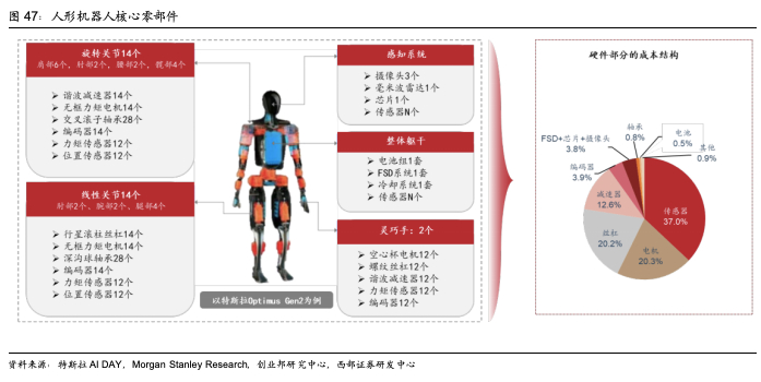 人形机器人产业链的上游为基础原材料以及零部件,中游为机器人本体和系统集成,下游为不同的应用场景。其中,核心零部件供给是未来机器人产业规模化发展的重要支撑。人形机器人的核心零部件和关键模块包括旋转关节、线性关节、灵巧手、感知系统、躯干。根据零部件量产价格和所用数量推算出人形机器人量产成本结构,其中电机、传感器、减速器、滚珠丝杠成本占比较大,也是构成机器人的关键核心零部件。