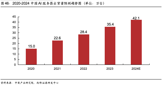 服务器配置通常包括CPU、内存(RAM)、存储设备、主板、电源和冷却系统等关键组件,其作为算力的核心载体,其市场需求随着 AI 技术的深入应用而呈现迅猛增长趋势。据 TrendForce 数据显示,2023 年 AI 服务器出货量达 120 万台,占总出货量的近 9%,年增长达 38.4%。