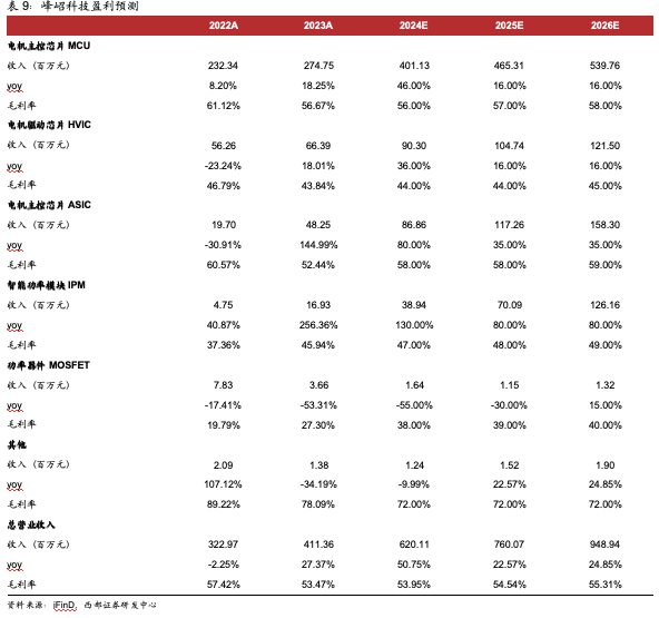 电机主控芯片MCU:电机主控芯片MCU是峰岹科技的核心产品, MCU贡献了公司五成以上的营收,公司的MCU产品凭借自主研发的双核架构及算法硬件化技术,显著提升了产品的集成度和毛利率。随着智能家电、新能源汽车及工业自动化等领域的快速发展,对高性能MCU的需求持续增长,公司凭借其在MCU领域的技术优势,有望进一步扩大市场份额。2024年上半年公司MCU业务营收1.74亿元,同比增长51.78%;随着汽车+工业+机器人等新兴市场增量落地,相关新产品营收持续增长与市场份额的提升,预计公司电机主控芯片MCU业务有望持续增长。毛利率方面,公司自研双核MCU具有一定的成本优势,预计未来毛利率呈缓慢上升趋势。因此,我们假设该业务2024-2026年营收增速为46%、16%、16%,毛利率水平为56%、57%、58%。