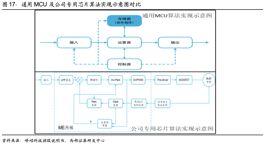 自研“双核”MCU中的ME内核通过算法硬件化,实现算速更优。不同于同行企业在通用芯片上用软件编程来实现电机控制算法,公司电机控制芯片通过硬件化的技术路径实现电机控制算法。即在芯片设计阶段通过逻辑电路将控制算法在硬件层面实现,提高运算速度的同时控制可靠性。