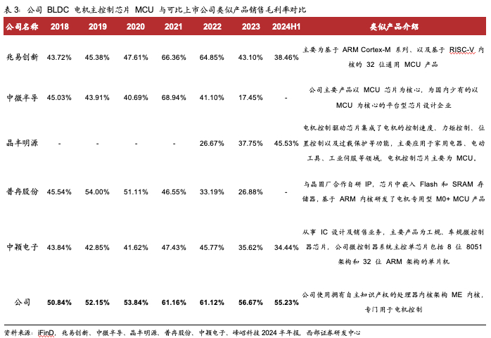公司自研“8051+ME(Motor Engine)” 双核MCU,其中,算法硬件化的ME内核,能显著提升芯片的性能,与采用ARM公司Cortex-M系列内核的通用MCU的其他公司相比,无需支付IP授权费用。公司多款系列产品颇具成本优势,在部分客户端,产品性价比高、竞争力强,毛利率水平显著高于同业可比公司。