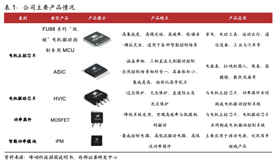 作为专注于高性能BLDC电机驱动控制芯片的设计公司,公司产品涵盖电机驱动控制的全部关键芯片。包括电机主控芯片MCU/ASIC、电机驱动芯片HVIC、电机专用功率器件MOSFET等。公司MCU/ASIC、HVIC、MOSFET芯片,通常按照1:3:6比例,共同组成BLDC电机驱动控制的核心器件体系。其中IPM可用于白电和机器人,公司寄予较高期望, 单价相对高,产品集成度高,性能好,成本控制好。
